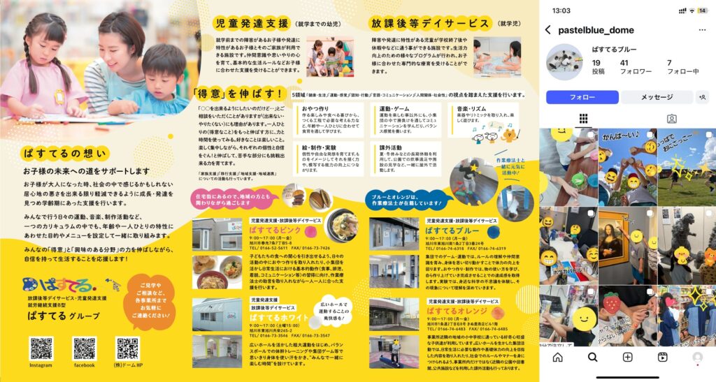 これまでは無料ブログで活動報告していたのですが、ホームページリニューアルに合わせて、各事業所ごとにインスタグラムを開設し、ホームページとインスタグラムを連携してもらいました。その結果、保護者様もインスタグラムをフォローしてくれて、投稿を見てくれるようになりました。色々と会話のキッカケになったりもしますね。また、各事業所でもインスタグラムのQRコードを書いた紙をお配りして周知したりと、私たちも工夫しています。これまでの取り組みに加えて、SNSも活用したこともあって、各事業所で保護者様に回答いただくアンケートでは【定期的に会報やホームページ等で、活動概要や⾏事予定を⼦どもや保護者に対して発信している】という項目で、95%の方が【できている】との評価をしてくださいました。保護者様や、これからご利用を考えていらっしゃる方々に、少しでも私たちの活動が伝わると良いなと思っています。